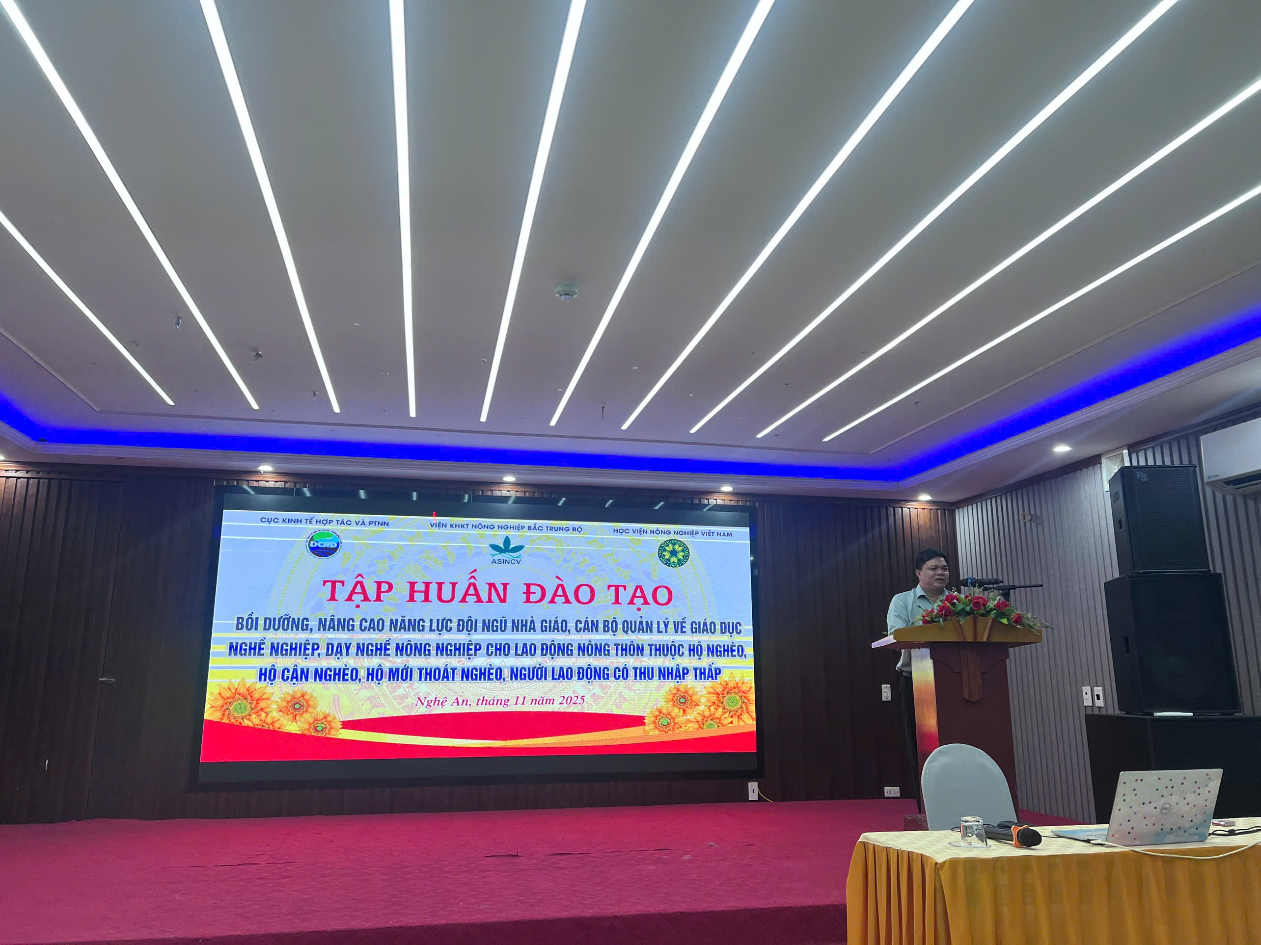 Nhằm trang bị kiến thức cho đội ngũ nhà giáo, cán bộ quản lý về giáo dục nghề nghiệp, dạy nghề nông nghiệp cho lao động nông thôn. Từ ngày 11/11 đến ngày 14/11/2025 tại phường Vinh Phú, tỉnh Nghệ An. Học Viện Nông nghiệp Việt Nam phối hợp với Viện Khoa học Kỹ thuật Nông nghiệp Bắc Trung Bộ đã tổ chức lớp tập huấn: “ Đào tạo bồi dưỡng, nâng cao năng lực đội ngũ nhà giáo, cán bộ quản lý về giáo dục nghề nghiệp, dạy nghề nông nghiệp cho lao động nông thôn thuộc hộ nghèo, hộ cận nghèo, hộ mới thoát nghèo, người lao động có thu nhập thấp”.