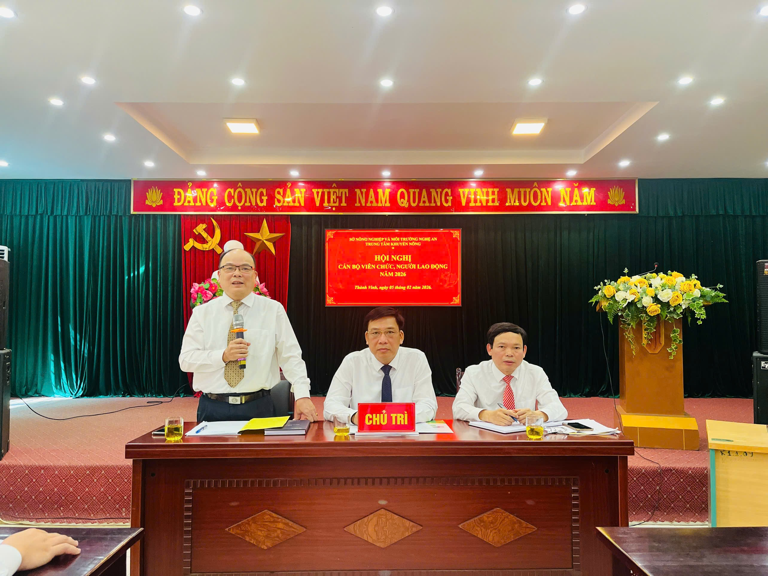 Phát biểu tại hội nghị, đồng chí Nguyễn Quốc Sơn – Trưởng phòng Tổ chức cán bộ Sở Nông nghiệp và Môi trường đã ghi nhận và biểu dương những kết quả mà Trung tâm Khuyến nông tỉnh Nghệ An đạt được trong năm 2025. Đồng chí đánh giá cao tinh thần đoàn kết, trách nhiệm của tập thể lãnh đạo, viên chức và người lao động Trung tâm trong việc triển khai hiệu quả các chương trình, mô hình khuyến nông, công tác chuyển giao tiến bộ khoa học kỹ thuật, đào tạo tập huấn và thông tin tuyên truyền, góp phần tích cực vào sự phát triển nông nghiệp, nông thôn của tỉnh. Đặc biệt, đồng chí ghi nhận và đánh giá cao sự chủ động, nghiêm túc và trách nhiệm của Trung tâm Khuyến nông trong quá trình thực hiện sắp xếp, sáp nhập và chia tách các Trạm Dịch vụ nông nghiệp cấp huyện theo chủ trương chung của tỉnh. Trong điều kiện khối lượng công việc lớn, yêu cầu tiến độ gấp, Trung tâm đã phối hợp chặt chẽ với các cơ quan liên quan để thực hiện tốt công tác bàn giao tổ chức, nhân sự, hồ sơ, tài sản theo đúng quy định; kịp thời ổn định bộ máy, đảm bảo hoạt động chuyên môn không bị gián đoạn, giữ vững vai trò hỗ trợ sản xuất và phục vụ người dân ở cơ sở. Đồng thời, đồng chí đề nghị trong năm 2026, Trung tâm Khuyến nông tiếp tục bám sát các chủ trương, định hướng của Bộ Nông nghiệp và Môi trường và của tỉnh; tập trung đổi mới nội dung, phương thức hoạt động khuyến nông theo hướng thiết thực, hiệu quả; đẩy mạnh ứng dụng khoa học công nghệ, chuyển đổi số, xây dựng các mô hình sản xuất theo chuỗi giá trị, gắn với nhu cầu thị trường; chú trọng công tác đào tạo, bồi dưỡng nâng cao năng lực cho đội ngũ viên chức; thực hiện tốt quy chế dân chủ cơ sở, chăm lo đời sống vật chất, tinh thần cho người lao động, góp phần hoàn thành tốt nhiệm vụ chính trị được giao.